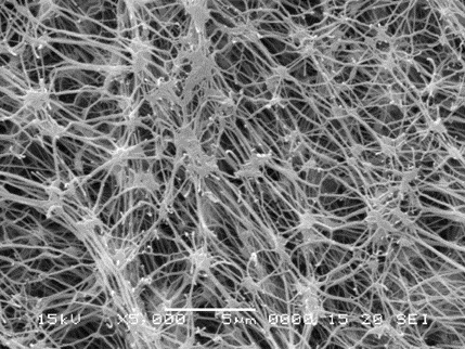 Экспандированный фторопласт — это волокнисто мягкий микропористый фторопласт (см. фото структуры), полученный высокодисперсной ориентационной вытяжкой заготовок из эмульсионного фторопласта при определенных соотношениях технологических параметров и вида напряженного состояния. Образование высокоразвитой свободной поверхности — это путь получения различного рода мембранных паро-газопроницаемых пленочных материалов и объемных мягких полимерных материалов с комплексом удивительных свойств.
